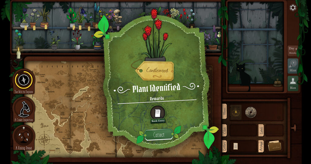 Im Kern führt man eine kleine Gärtnerei in einem verschlafenen Städtchen, irgendwo in einem düsteren viktorianisch angehauchten Setting. Von draußen dringt Regen an die Fensterscheiben, eine schwarze Katze liegt auf dem Tresen und schnurrt leise, während man sich durch alte Bücher blättert und sich mit der Welt der geheimnisvollen Pflanzen auseinandersetzt oder auf der Karte die nächsten Exkursionen für neue Pflanzen plant.