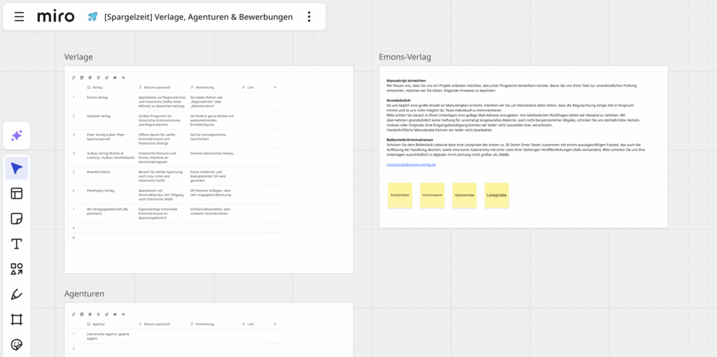 Ich habe mir aber unter der Woche die freie Zeit genommen, um eine Liste mit Verlagen und Literaturagenturen zusammenzustellen, zu deren Portfolio mein Roman passen könnte. Es war spannend zu sehen, wie unterschiedlich die Schwerpunkte und Programme der einzelnen Häuser sind – von traditionsreichen Verlagen mit Sparten, die man bei ihnen noch nie gesehen hat, bis hin zu kleineren, thematisch sehr spitzen Verlagen, die auch aktiv neue Autoren suchen. Ich habe anhand der Webseiten geprüft, wo mein Manuskript thematisch und stilistisch gut aufgehoben sein könnte.