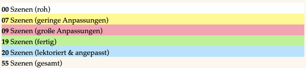 In der kommenden Woche will ich mich zunächst den Figuren widmen. Ich freue mich darauf, wieder in ihre Köpfe einzutauchen und neue Facetten zu entdecken. Danach folgt der Rest. Schritt für Schritt. Euch einen guten Start in die Woche!
