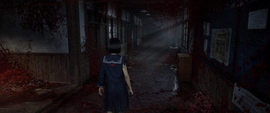 Der Ort “Silent Hill” ist in Silent Hill f übrigens Ebisugaoka, der fiktive Heimatort der Figuren. Religiös und von Folklore geprägt. Ich weiss zu wenig über die japanische Kultur, um hier eine tiefere Analyse zu schreiben, aber durch die vielen zu findenden Tagebucheinträge, Schriften und Zeitungsartikel wird klar, dass Aberglaube und Tradition von der Bevölkerung hier so gedeutet wird, wie es für alle bzw. die Gesellschaft am besten passt. Und das unterstützt das Grundthema des Spiels. Es gibt Schreine, die mythologische Figur des Fuches und jede Menge traditionell inspirierter Items und Rätsel – jedoch konnte ich mich hier nur auf die spielmechanischen Einflüsse konzentrieren. Das Dorf Ebisugaoka selbst ist hervorragend in der Tradition der Reihe umgesetzt. Weitläufige Straßen wechseln sich mit engen Gassen und verwinkelten Wegen ab. Man bewegt sich nicht nur zwischen Gebäuden im Dorf, sondern macht auch Abstecher auf die Reisfelder außerhalb und größere Anwesen vor dem Dorf. Alles eingehüllt in den bedrohlichen Nebel. Und auch Traumareale und albtraumhafte Versionen von Schauplätzen gibt es. Es fällt schwer zu unterscheiden, was innerhalb des Spiels Realität und was Einbildung ist. Ich bin mittlerweile der festen Überzeugung, dass nur die ersten drei Minuten kein Traum sind – der Rest ist der Kampf von Hinako mit ihren inneren Dämonen.