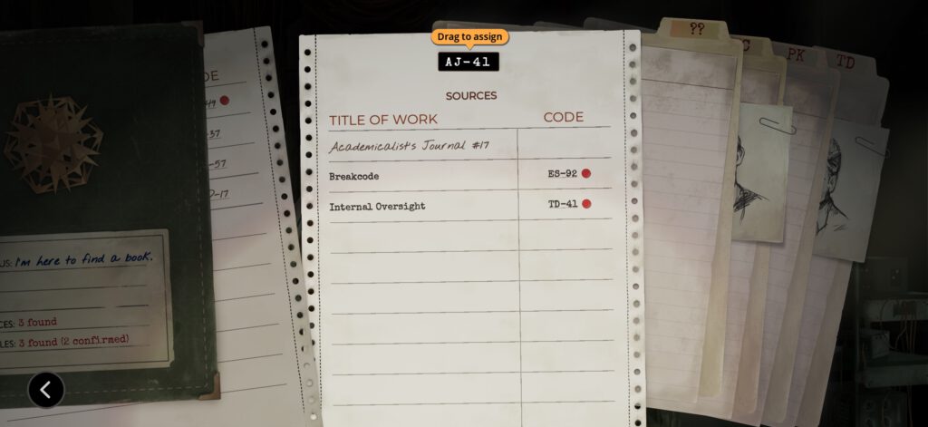Die Steuerung ist simpel: Man tippt Codes ein, blättert durch Archive, verbindet Archivkürzel zu Buchtiteln und schaltet so neue Einträge frei. Immer auf der Suche nach dem ominösen einen Buch, was unser mysteriöser Auftraggeber haben will. Dieser ist uns übrigens über Funk zugeschaltet und bewacht den Eingang einer Kirche in der wir in einem alten Keller die wundersame Archivmaschine bedienen. Klingt verwirrend? Ist es aber nicht. Die Haptik, das Sounddesign, die Art, wie die Geschichte sich langsam entfaltet, das alles ist so durchdacht, dass es sich anfühlt, als hätte man ein kleines, interaktives Buch in der Hand.
