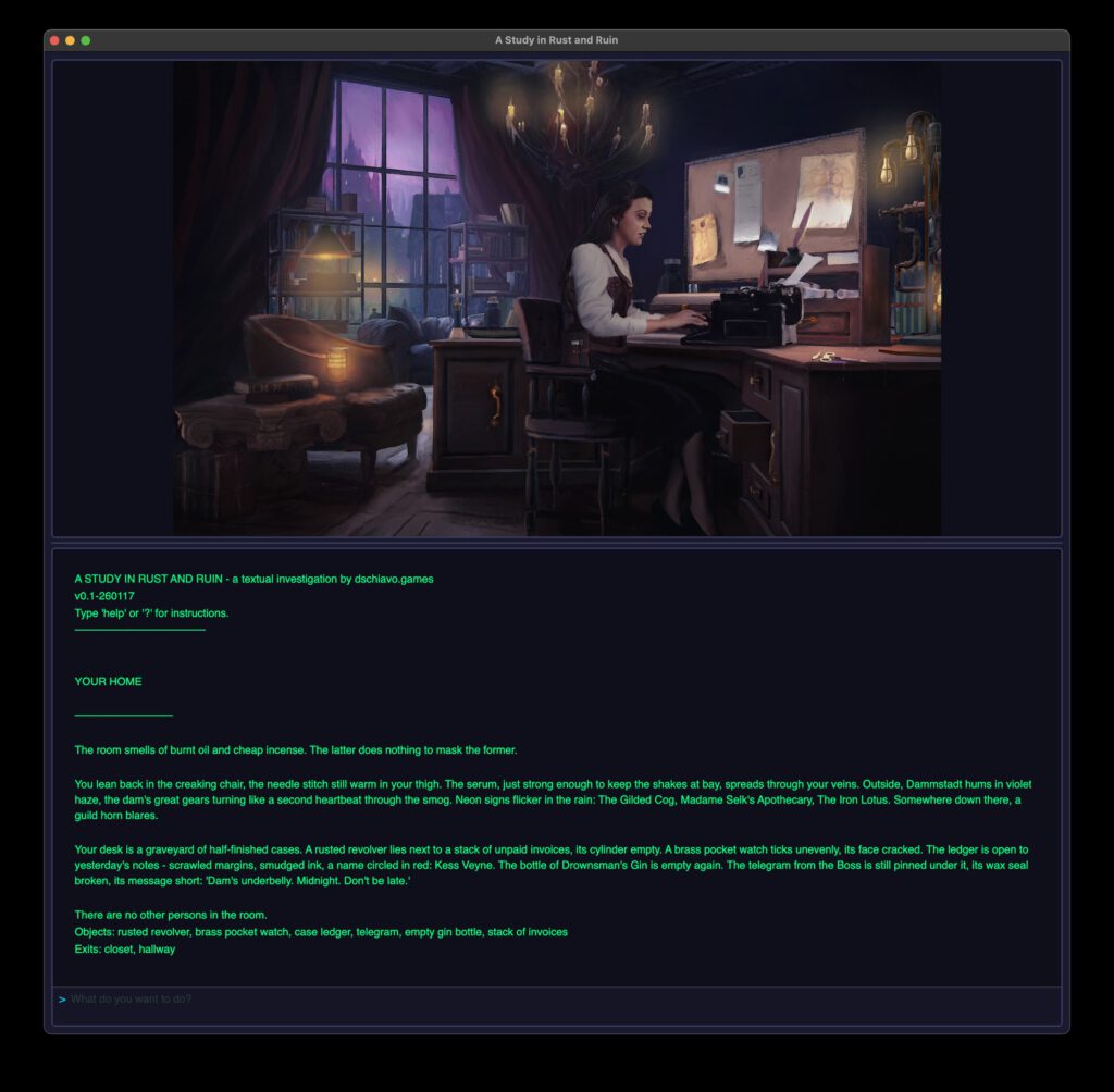 Ich bin von meinem Ergebnis bisher sehr angetan und habe mich dazu entschlossen, die Entwicklung des Spiels weiter zu verfolgen. Ich habe es (in Anlehnung an die berühmte Sherlock Holmes Geschichte) “A Study in Rust and Ruin” getauft und eine itch.io-Seite angelegt (hier klicken). Ich werde in Zukunft auch hier im Blog berichten, wenn es Neuerungen gibt.